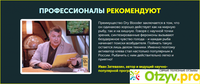 Отзывов о продукте много, все со знаком плюс. Активатор работает, как и заверяет производитель, позволяя вытаскивать рыбу за рыбой. Сегодня отпадает надобность в других приманках, поиске удачного рыбного места, множества приспособлений для ловли рыбы – это все заменит пакетик Dry Blooder. Мужчины рыбаки пишут, что не променяют приманку ни на одно приспособление, так как она экономит не только время, но и деньги.