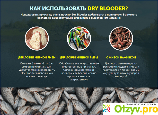 На упаковке Dry Blooder подробно описан способ приготовления приманки. Для мирной рыбы понадобится один килограмм прикорма и один пакет приманки, для хищной рыбы соотношение ингредиентов такое же, но нужно еще обработать раствором снасти. Если ловить рыбу на живца, то есть на червяка, то лучше его окунуть в тот же раствор 2 пакетика на пол-литра воды, воду лучше все брать их места для ловли – водоема, озера, реки и т. д. Один пакет содержит 6 гр. концентрированного порошка, который можно использовать на любом водоеме и в любую погоду. Производитель дает несколько рекомендаций по способу ловли, например для поднятия рыбы со дна, лучше всего кидать в воду небольшие шарики из прикорма с активатором, которые сохранят форму до самого дна.