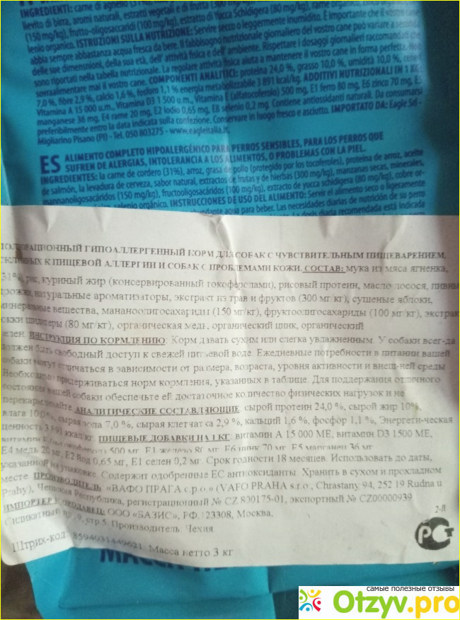 Данный корм производится в Чехии. Производитель заявляет, что производится корм на основе легкоусвояемых и гипоаллергенных продуктов и содержит не менее 40% мяса. В нашем случае это ягненок с рисом.
