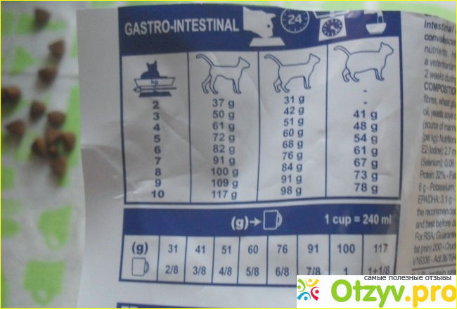 Кстати, корм очень сытный, калорийный. Жира в нем в два раза больше, чем в кормах "для стерилизованных" котов . Нормы кормления указаны. Например, мои коты весом по 4 кг должны получать не больше 50 грамм такой еды в сутки. Гранулы тоже очень мелкие. Есть кошки, которые любят гранулы целиком, не раскусывая глотать. Мой младший кот до 3-х лет так ел. Так вот, ничего страшного не произойдет, корм отлично усваивается.