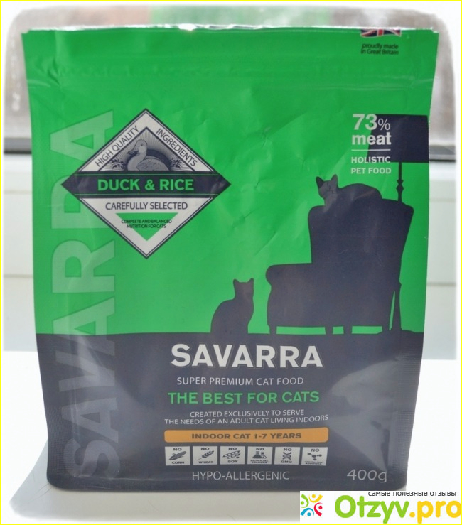 В корме Savarra Indoor Cat отсутствует курица и ее жир, кукуруза, пшеница, соя. Содержание питательных веществ, минералов и витаминов превосходит показатели многих кормов вдвое!