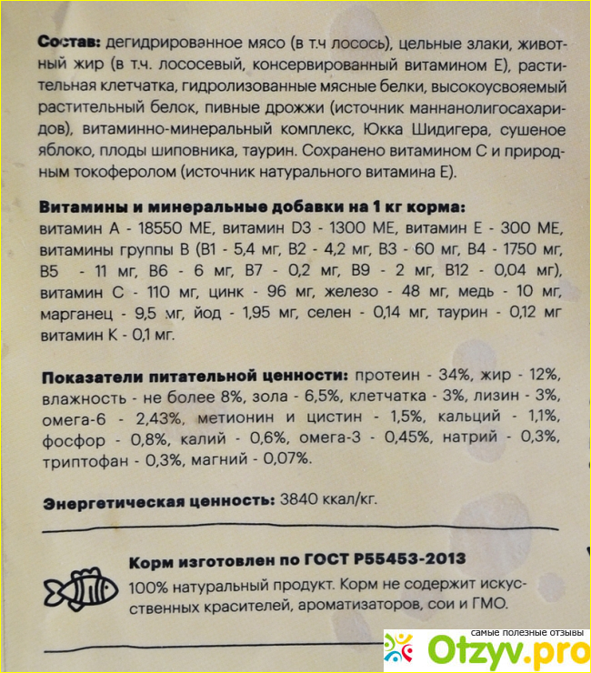 Еще очень важное достоинство – состав: отсутствие искусственных консервантов, ГМО, сои. Действительно корм содержит рыбный запах, что очень нравится моей «красавице» (она у меня рыбная дама)