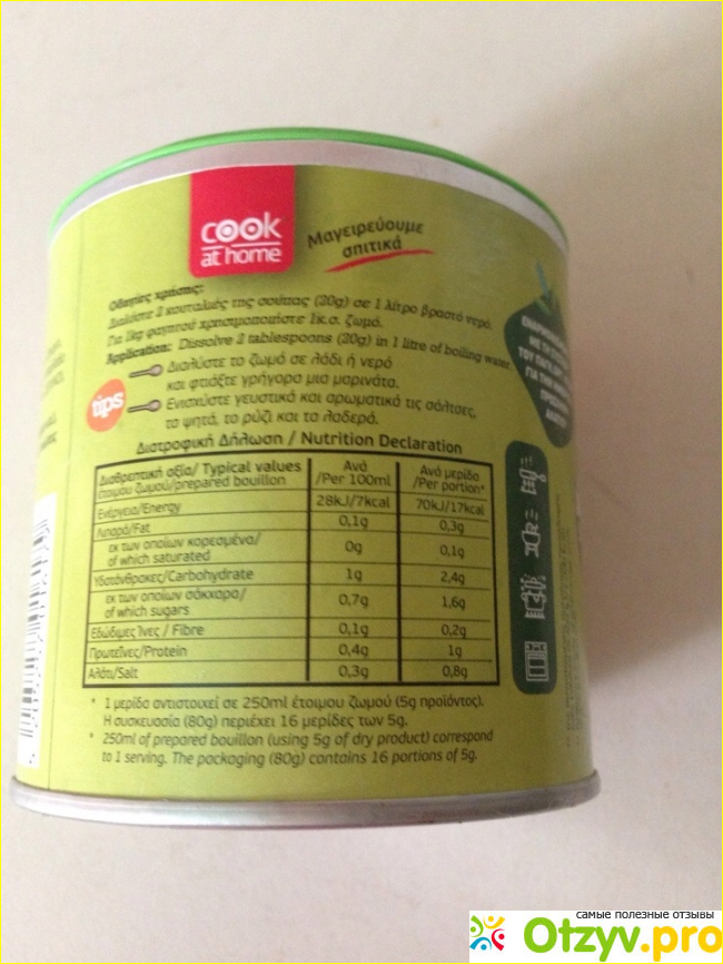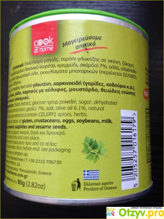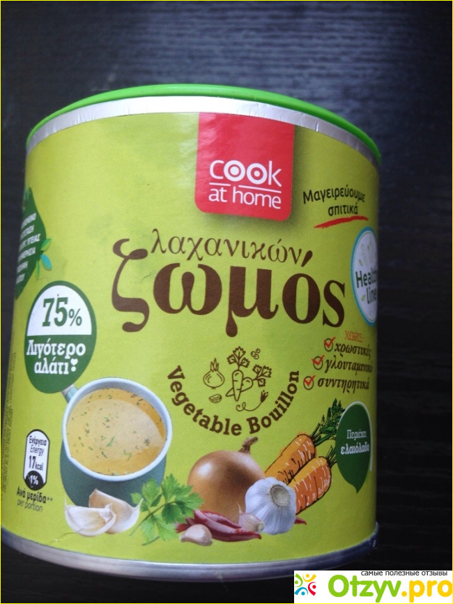 сухом же бульоне греческой торговой марки Cook at home, уже собран комплекс вкусных и ароматных трав и сушеных овощей, которыйпридает любому блюду насыщенный вкус.