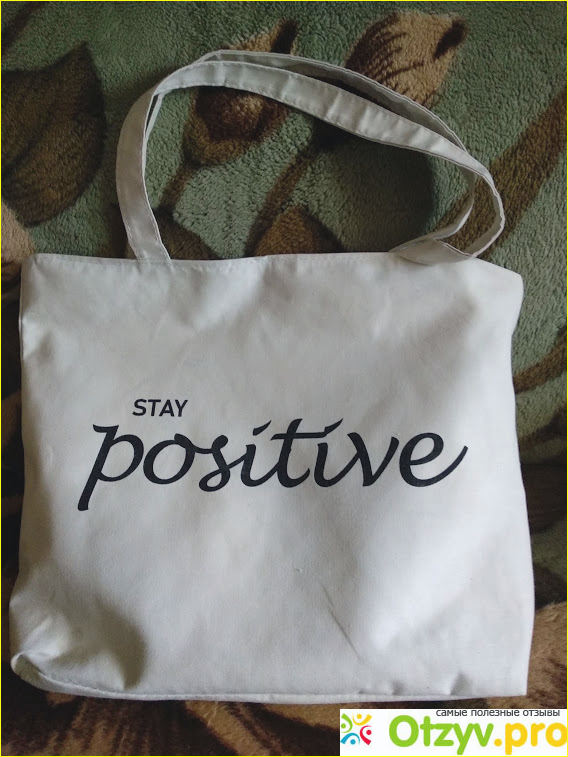 Хотя сумка не белоснежная, оттенок топленого молока. Но, выбора цветов не было. Различался лишь принт. На моей сумке очень жизнеутверждающий принт Оставаться позитивной. Так я перевела с английского надпись.