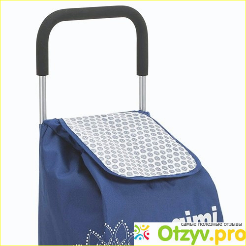 Ручка верхняя прямоугольная с местами для держания, которые не скользят. Верх ткани стягивается на завязки и закрывается крышкой. Внизу находится опорная ножка, если необходимо поставить сумку, она из крепкого пластика. Когда везешь тележку, ручка приподнимается и не касается земли.