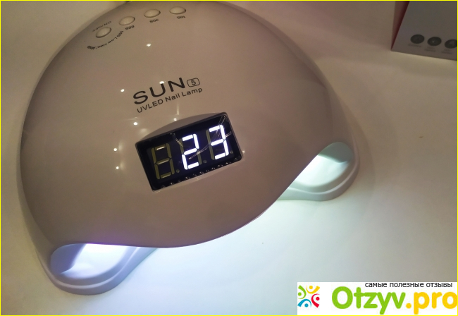 По весу лампа легкая, шнур длинный. Имеет три таймера: 10 сек, 30 сек, 60 сек. А также переключение мощности с 48 вт на 24 вт. Этой функцией я не пользовалась ни разу, так как она увеличивает время сушки, но, безусловно, это полезная функция для тех, у кого сильно жжет ногти при сушке. А вот чем я пользуюсь непрерывно, так это сенсором, то есть кладешь руку в лампу она включается, очень удобно, вытаскиваешь-выключается, а на дисплее отображается время сушки и можно не пользоваться кнопками вообще. Вот так она выглядит в работе.