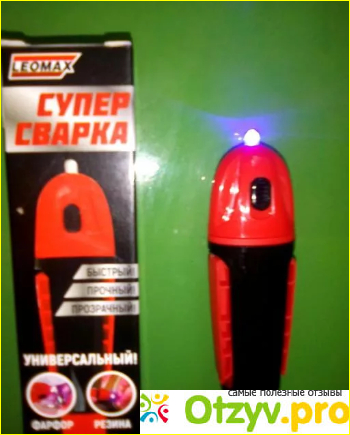 Супер-сварка действует расплавленным полимером. Он остается жидким внутри стержня, но когда оказывается на свету, то начинает застывать. Лучше всего сцепляется под ультрафиолетом. Именно поэтому на ручке есть соответствующая лампочка.