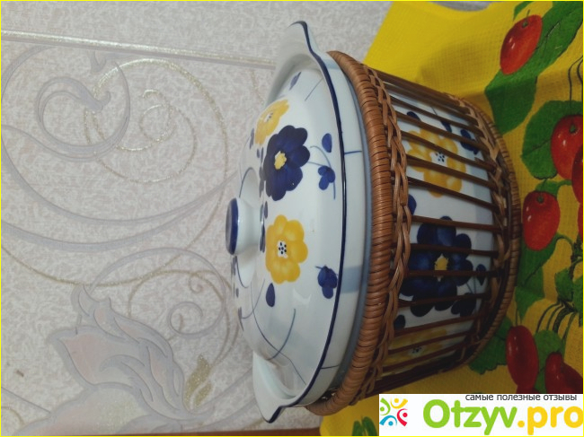 У супницы две удобные ручки, и в комплект входит прочная крышка и плетёная корзинка - подставка.