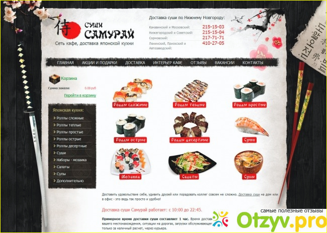 Да и на сайте все очень красиво оформленно в плане блюд, когда голоден, можно своими же слюнями подавится от этих картинок, да молодцы, стараются люди и ребята, чтобы побаловать нас и накормить вкусными роллами и сушами, да по поводу первых блюд и закусок, тая я лично не пробовала, а вот пиццу и выпечку десертов, я предпочитаю готовить самостоятельно в свободное от работы время.
