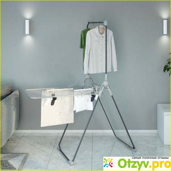 Сушилка устойчивая: когда она пустая, она крепко стоит на полу сама по себе. Это очень важно: если сушилка изначально неустойчива, она может банально упасть под весом мокрого белья.