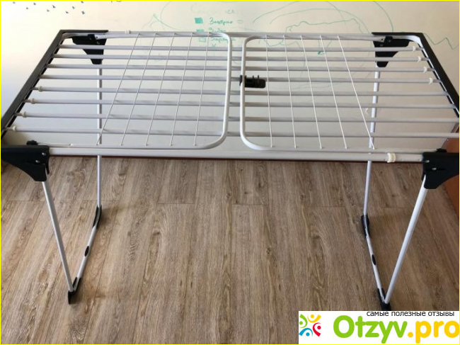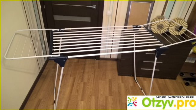 Данная сушилка рассчитана на большую площадь (рабочая длина сушилки тридцать метров). Внешне выглядит совершенно обычно, в собранном виде не займет много места и может храниться за дверью, которой мало пользуешься - есть комнаты дверь в которые почти не закрываются.
