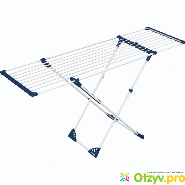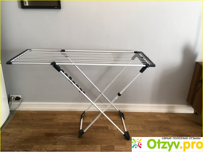 Поставить ее может даже подросток, ведь это не только быстро, но и достаточно легко. Раздвинули ножки сушилки, закрепили специальным клапаном и готово. На вид она хлипкая, и не устойчивая. А вот на деле все нормально. Главное правильно распределить одежду, не вешать на одну сторону.