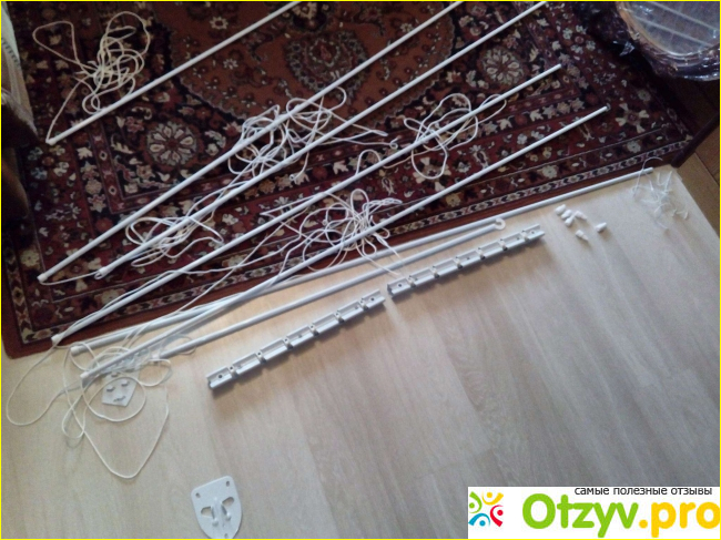 В упаковке был также длинный крючок, необходимый для управления этой системы. Этим крючком можно зацепить кольцо нужной верёвки и опустить вниз одну штангу. Так можно опустить все штанги.