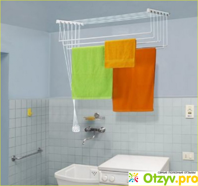 Штанги изготовлены из металла, они являются своеобразным лифтом для чистого белья, который можно опускать по тросикам, для того, чтобы развесить белье. После этого уже с бельм поднять до потолка, чтобы белье сохло. Это поможет экономить пространство внизу. Такого типа сушилки отлично подойдут для ванной комнаты, для балкона, если не хотите его занимать напольными сушилками. Сушилку также можно размещать на любом открытом пространстве, где вам будет удобно.