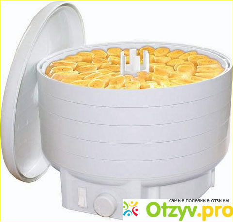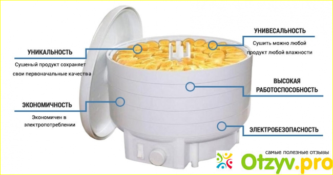 Благодаря конвекционной системе (потоки нагретого воздуха равномерно распределяются вентилятором по этажам с продуктами - тепло идет от центра) нарезанный продукт быстр сохнет и сохраняет все полезные свойства.