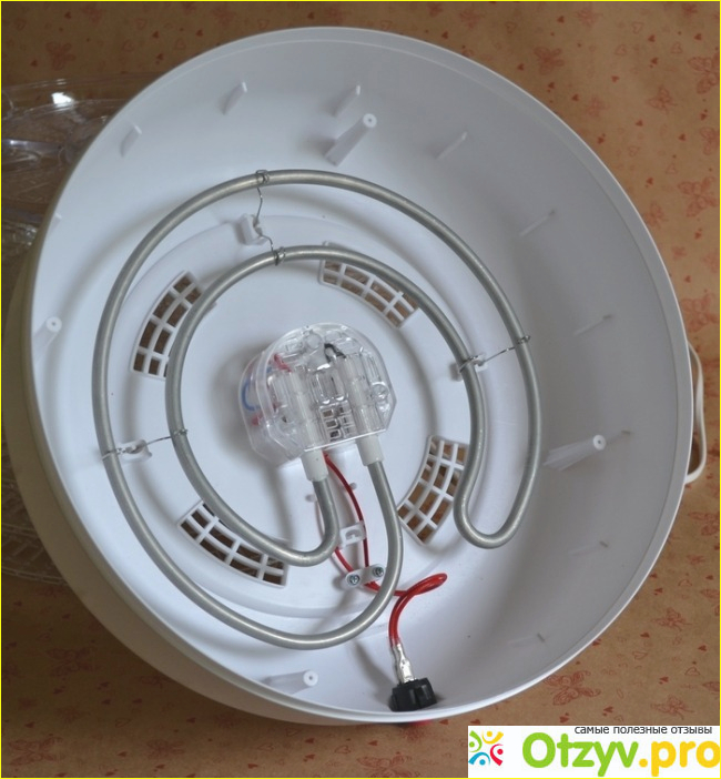В днище сушилки установлен нагревательный элемент, ответственный за процесс сушки. Вентилятора, который бы гонял горячий воздух по поддонам, не предусмотрено. С одной стороны это плюс - сушилка абсолютно бесшумно. Но с другой, отсутствие принудительной вентиляции увеличивает время высыхания продуктов.