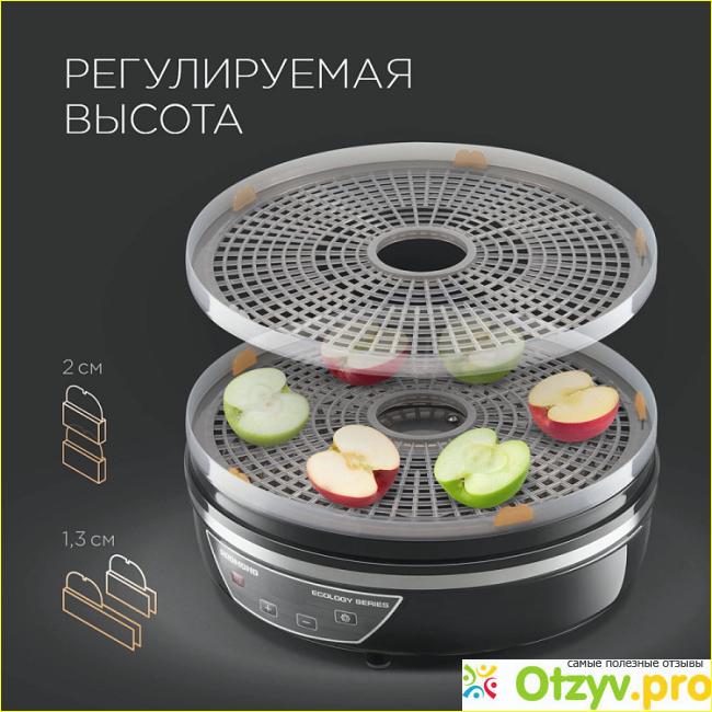 Пять уровней — это круто, потому что можно сушить сразу много продуктов, экономить время и место на кухне. Температуру можно регулировать от 35 до 70 градусов, в инструкции все прописано, для каких продуктов какой режим выбрать, это хорошая помощь для меня. Поддоны сделаны из прочного термостойкого пластика, с рифлёной поверхностью, чтобы продукты не прилипали и их легче было мыть. Корпус и уровни прозрачные, так что можно видеть, как идёт процесс сушки. Высота сушилки регулируется, можно использовать столько поддонов, сколько нужно. Вот это супер-удобно, не каждая сушилка такое может, даже можно положить морковку целиком, если надо. Управлять сушилкой легко — на панели всего 4 сенсорные кнопки для включения, изменения температуры и установки времени сушки. Яркий дисплей показывает время и температуру. В комплекте идёт поддон для пастилы, с его помощью можно сделать эту вкусняшку самому. Яблочное пюре, например, распределяю по поддону и оно равномерно высыхает. Хороший прибор, нужный.