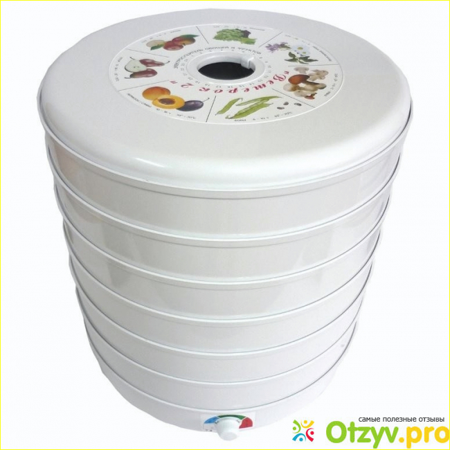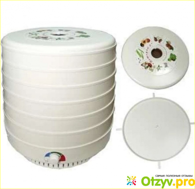 В приборе имеется вентилятор и предусмотрен тэн, который находится внизу. Закрыты они особым листом железным, на нем есть отверстия для того, чтобы теплый воздух распределялся равномерно по всему объему внутри. Сверху в приборе имеются шесть сеточек-решеток, они круглой формы, вместительность каждой составляет пять литров, а сушилка в общем имеет очень хороший объем на 30 литров. Также имеется крышка, на ней предусмотрены отверстия, чтобы мог выходить изнутри воздух.