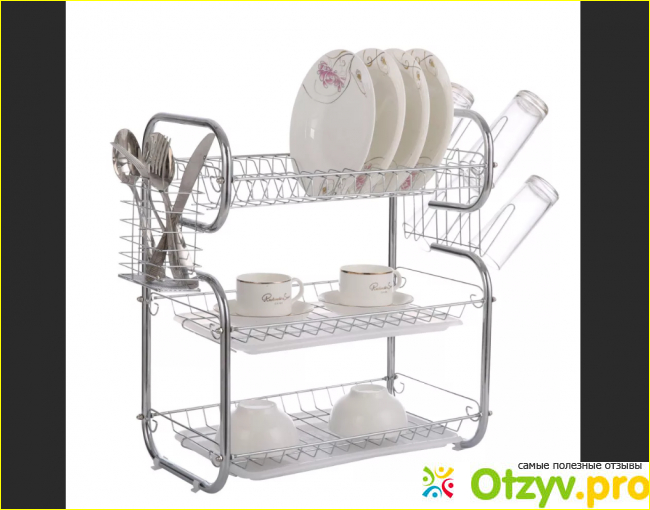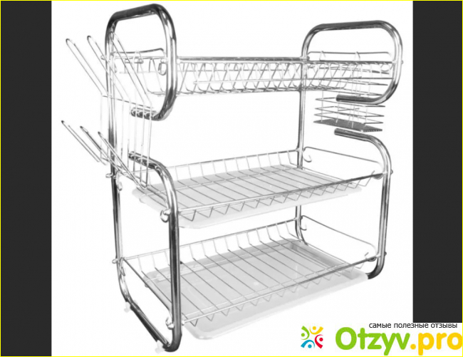 Далее хочу подробнее рассказать о характеристиках данной модели. Сушилка для посуды Bohmann BH-7326 состоит на сто процентов из стали. По типу она является настольной, то есть в шкаф ее повесить нельзя, она не подвесная. В комплекте есть два поддона, под нижним и средним ярусом, на них стекает вода от вымытой посуды. Так что не переживайте, стол останется абсолютно сухим. Всего посудосушка имеет три яруса, самый узкий из них расположен вверху. На него мы обычно складываем столовые приборы, такие как ложки и вилки.
