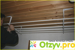 Монтаж несложный: сначала крепится основной каркас, к нему подвешиваются веревки, которые регулируются на нужной высоте. Ничего сложного конструкция сушилки из себя не представляет. Это череда полых труб из пластика или металла и моток веревок.