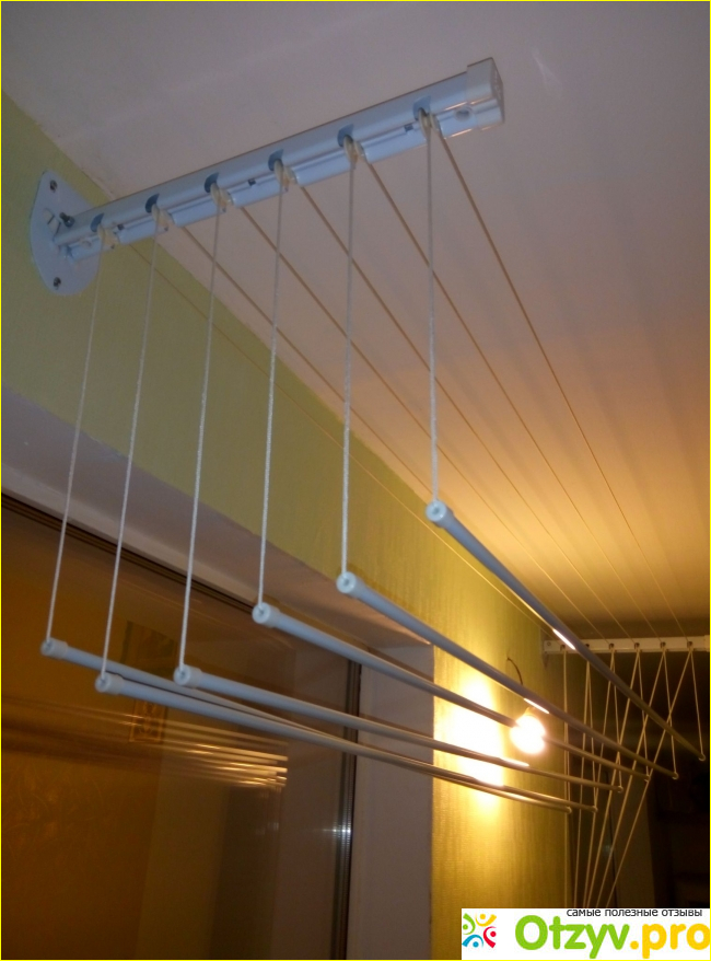 Конструкция очень удобная. Вызывает некоторое затруднение монтаж подвесной сушилки, иногда на это требуется не менее трёх часов. Но потом пользоваться такой сушилкой очень удобно. Приспособление долговечное, отличается длительным сроком службы.