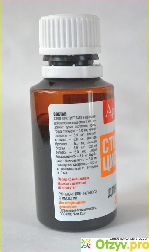 Стоп-цистит для кошек представляет собой коричневую горьковатую жидкость, пахнущую травами. Состав у нее полностью натуральный, вреда животному не будет. Только если аллергия, но от нее никто не застрахован.