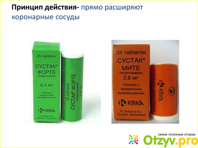 Герой моего обзора Сустак Форте тоже из этой “пьесы” – в его составе содержится нитроглицерин, выпускается в форме таблеток. Относится к вазодилатирующим веществам, оказывает спазмолитическое, антиангинальное действия, помогает расслабить гладкую мускулатуру органов желудочно кишечного тракта, желчевыводящих путей, сосудистой стенки, мочеточника, при внутривенном введении нитроглицерина помогает быстрее снизить преднагрузку на миокард. Нитроглицерин помогает равномерно распределить коронарный ток крови, особенно в тех местах, где уже началась ишемия тканей. Также вещество угнетает болевой синдром, который развивается во время приступа стенокардии, снимает спазмы, расширяет сосуды головного мозга, именно поэтому очень частыми побочными реакциями является головная боль.