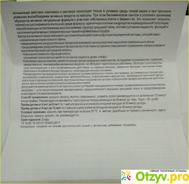 Муж пропил 10 дней этот препарат, перестав принимать паралельно медикаментозные, и в целом сказал, что, как минимум, хуже не стало. Более того, спустя дней пять дискомфорт, который он часто чувствовал по утрам, после ночного сна, прошел. Спустя 10 дней он рискнул отменить процедуры, чтобы понимать, действует ли БАД полностью, или все же как поддержка при терапии. Результат своеобразного эксперимента порадовал и как итог мы заказали еще Сусталайф, чтобы пройти положенный курс в 30 дней. Сейчас уже месяца три прошло с последнего приема препарата и пока что мы не возобновили походы в больницу, сустав чувствует себя хорошо и не доставляет проблем. В общем, на ранних стадиях от него определенно есть толк, в запущенных - не стану советовать, нам в свое время помогла только операция.
