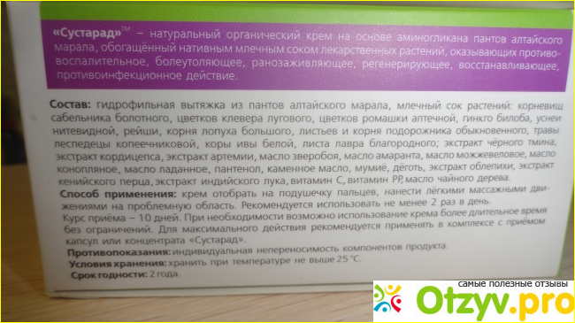 Тут нам приписывают основной элемент, который содержится в креме - это панты марала или рога молодого оленя, обитающего в Алтайском крае. Не могу вам тут ничего приписывать, лично мое мнение - косметический эффекта данные панты наводят, но ничего более. Надо еще отметить очень широкий спектр применения комплекса Сустарад, приводит производитель приличный список. Давайте поближе ознакомимся с препаратом.