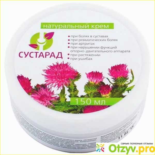 Ромашка-успокаивает и давит воспалительный процесс. Мумие- Вы знаете же, что это такое!-практически комплекс лечения-тут и кости сращивает, и ткани восстанавливает и все, что угодно. Клевер-производит нормализацию кровообращения. Это же действие производит облепиха и тмин, вытяжка из которых входит в состав этого чудо-крема, наряду с другими компонентами. Плюс к этому , эти составные части, еще восстанавливают ткани мышц и даже задерживают старение костно-мышечного аппарата. Пантенол-, о нем можно и не говорить, но я скажу, очень эффективно заживляет раны. Ну и наконец, два вида витаминов-"С" и РР-они несут , кроме омолаживающего эффекта , еще и восстановительные функции. Медики рекомендуют крем "Сустарад" совместно с капсулами , с таким же названием, в этом случае , эффект будет неизмеримо выше. В состав капсул , кроме вышеперечисленных компонентов, входят еще:перегородки грецкого ореха, брусника, мелисса и многое-многое другое, все очень полезное и нужное. Все , что способствует восстановлению соединительной(суставной) ткани.