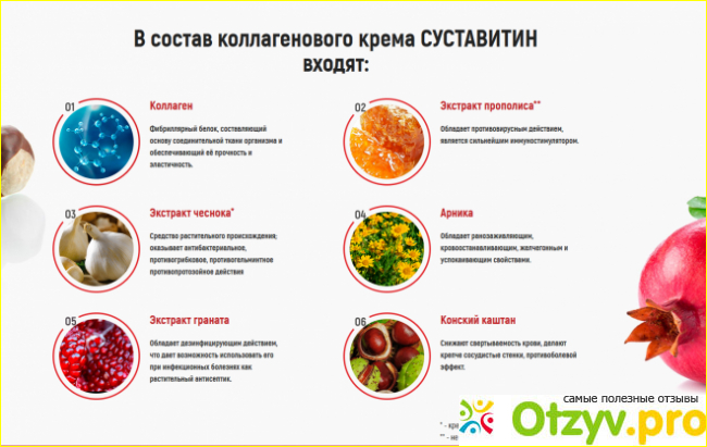 Суставитин крем состоит из компонентов природного происхождения, а именно - вытяжка чеснота, коллаген, экстракт граната и арники, прополиса и конского каштана. За такой состав, как видите, очень жаль отдавать такие деньги, согласитесь. Отдельно каждый компонент очень дешевый, и в совокупности должен стоять максимум рублей 300, а не 1900 руб. ( и это со скидкой) чеснок, как всем известно является антибактериальным средством, его используют в качестве антивоспалительного средства, а также антигрибкового, он усиливает иммунитет, и как бы останавливает заболевание, как сообщает производитель. Идем дальше – коллаген. Именно он практически во всех мазях и кремах для суставах помогает соединительной ткани, он делает ее эластичной, тем самым дает суставам и хрящам прочность, укрепляет всю костную систему, но это только в том случае, если нет серьезного разрушения. При разрушении суставов, а также при их деформациях коллаген уже бессилен.Гранатовый екстракт убирает отечность, а также инфекцию, снижает боль в области больного участка. Арника способствует заживлению ран, ускоряет процесс регенерации костной ткани, а также снимает боль и спазм. Так что только при начальной стадии заболевания опорно-двигательной системы есть смысл использовать подобный крем суставитин, но также эффективным будет тот же нимид гель, который стоит 200 рублей, или хондрасила, помните об этом!