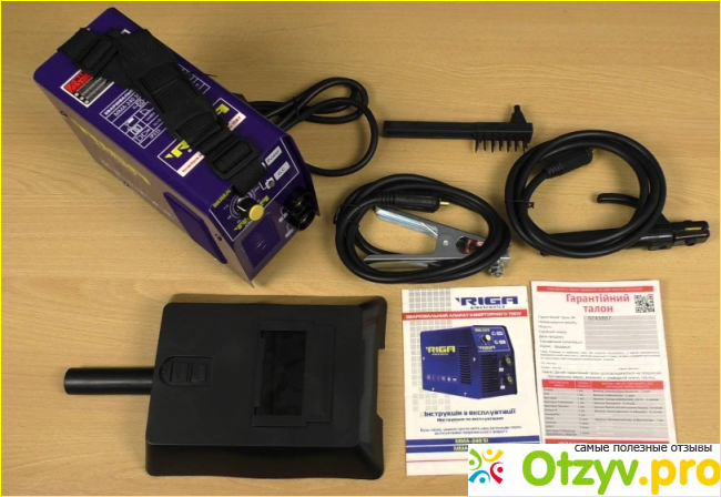 В комплект входит собственно сам инвертор, с ремнем для переноски и кабелем подключения к сети 220В; два сварочных кабеля с зажимом для "массы" и держателем для электрода; универсальный инструмент "щетка-молоток"; защитная маска; инструкция. Все это помещено в черный пластиковый кейс.