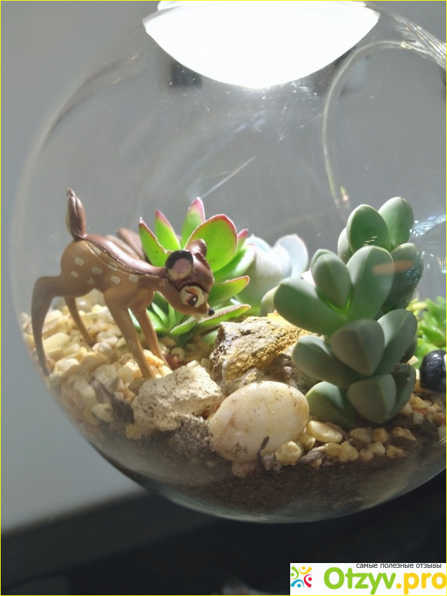 Светильник доставили быстро, упакован он был хорошо и надежно. В этот же день я зашла в цветочный магазин, купила песочка, земли, камушков и ракушек. Посадила суккуленты, у меня в светильник полезло три цветка, насыпала сверху песка, камушков и украсила ракушками и фигуркой. И знаете, как это все круто смотрелось!