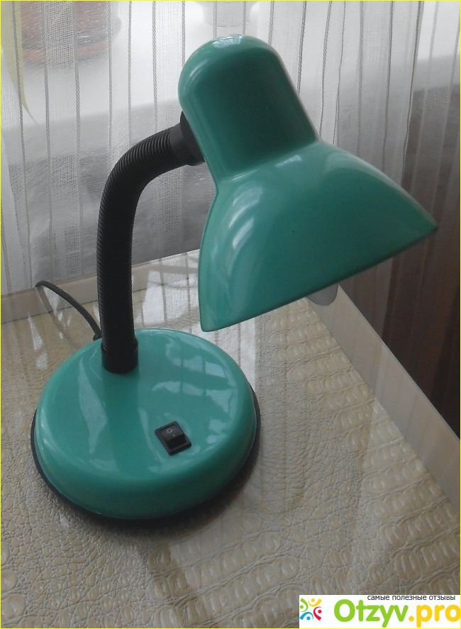 Как я уже написала выше, мною было куплено две лампы. Первая была оранжевого цвета, я приобрела ее для письменного стола дочери. Светильник небольших размеров, много места не занимает, гофрированный шнур позволяет менять положение плафона, а с ним и направление света. За месяц работы не было никаких нареканий, поэтому я купила второй светильник - зеленой окраски корпуса, его я поставила на стол, за которым сама работаю на компьютере или шью. В ассортименте имелись также лампы с белым и черным плафоном. К любому интерьеру можно подобрать такой прибор.