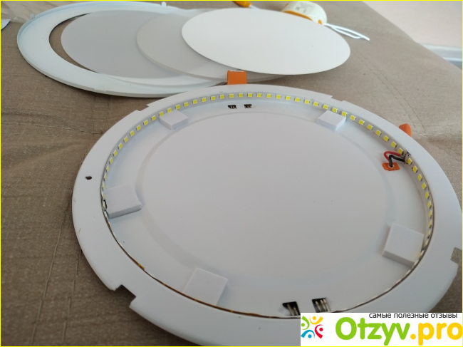 Внутри, кстати, у светильника устроено все просто. Сначала идет белый отражатель, затем оргстекло-призма, во внешний край которой направлены светодиоды, далее стоит рассеиватель. Свет от светодиодов идет по телу призмы и отражаясь от белого отражателя проходит сквозь рассеиватель и освещает то что вам нужно.