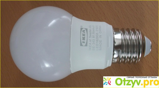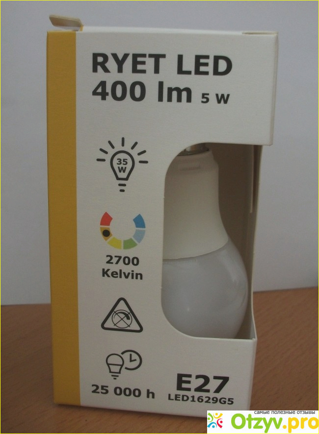 Светодиодная лампа Икея Райет,(Ikea Ryet LED) 400 лм, 5 вт была куплена в одноименном магазине за 70 рублей. Учитывая бОльший срок службы и экономичность, думаю, она полностью окупит разницу в цене. Светоотдача этой 5 ваттной лампы 400 люмен, такая же, как у 35 ваттной простой. Цветовая температура 2700°К, что то же соответствует обычной, (белый тёплый свет). Коэффициент пульсаций небольшой, 9 - 19%.
