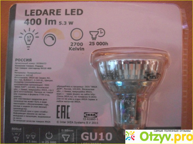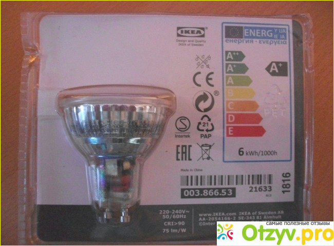 Хотя производятся они, как почти и все, у нас продаваемое, в Поднебесной, лампы Ikea Ledare по праву можно считать лучшими из всего, что у нас можно встретить в продаже. Гарантию производитель даёт на 25000 часов, это в 20 раз превышает срок службы обычных ламп накаливания. Кроме того, эти лампы позволяют довольно существенно экономить на расходе электроэнергии. При одинаковой силе света, (измеряется в люменах и указана в маркировке), они потребляют её на 85% меньше. Конкретно эта лампа, потребляя всего 5,3 ватт, светит так же ярко, как обычная лампочка в 57 ватт, (400 лм.).