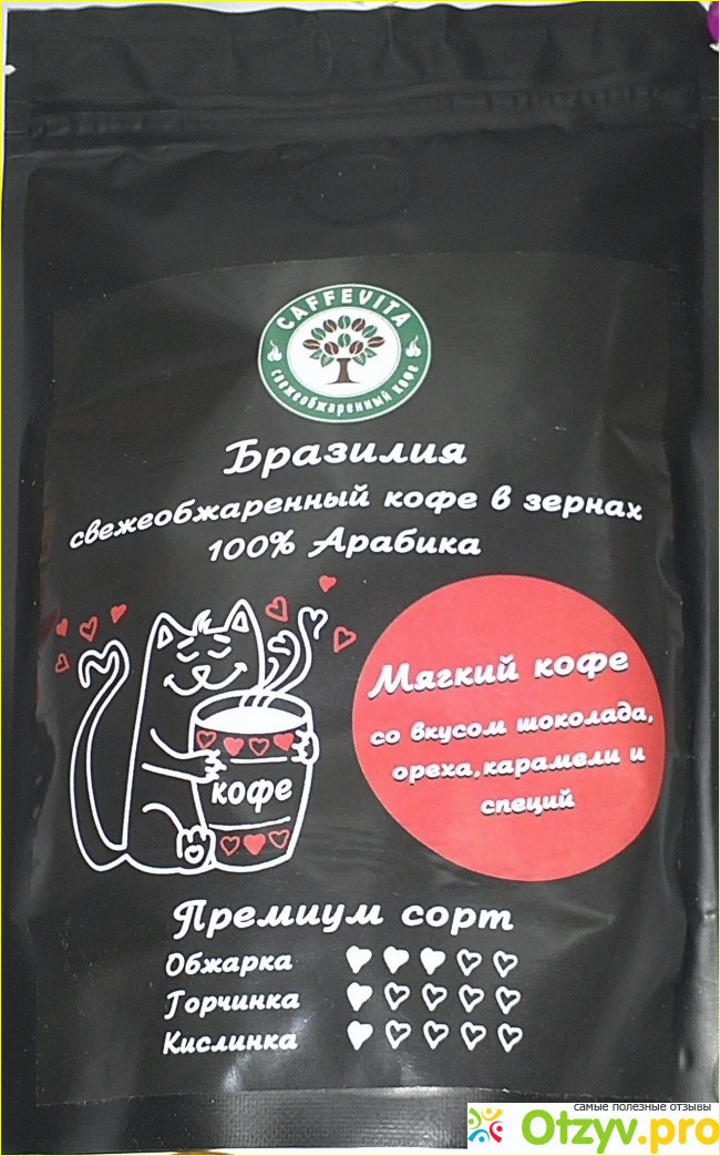 Свежеобжаренный кофе в зернах Caffevita Бразилия расфасован в черную фирменную упаковку, имеющей свой стиль. Там есть одна отличительная персона - довольный кот, пьющий кофе. А почему нет?
