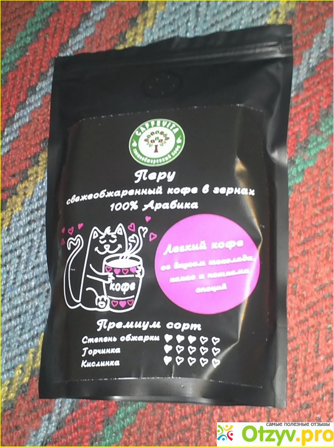 Зерна расфасованы в симпатичные плотные пакеты, на которых изображен фирменный добродушный кот. Упаковка грамотная и крепкая, снабженная специальным"сифоном", через который вы можете ощутить аромат свежеобжаренных зерен. Можно открывать и закрывать много раз. После перемолки я ссыпаю все обратно в нее и храню в темном и сухом месте.