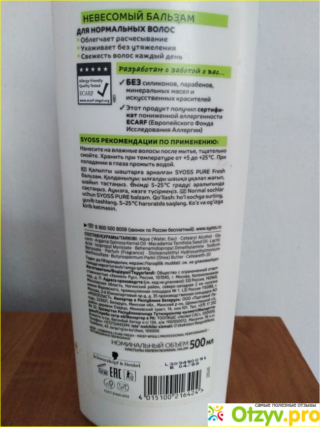 И заодно приобрела невесомый бальзам для волос Pure Fresh SYOSS. Бальзам предназначен для ежедневного ухода для нормальных волос. Я использую его реже, но при каждом мытье головы, в течении месяца.