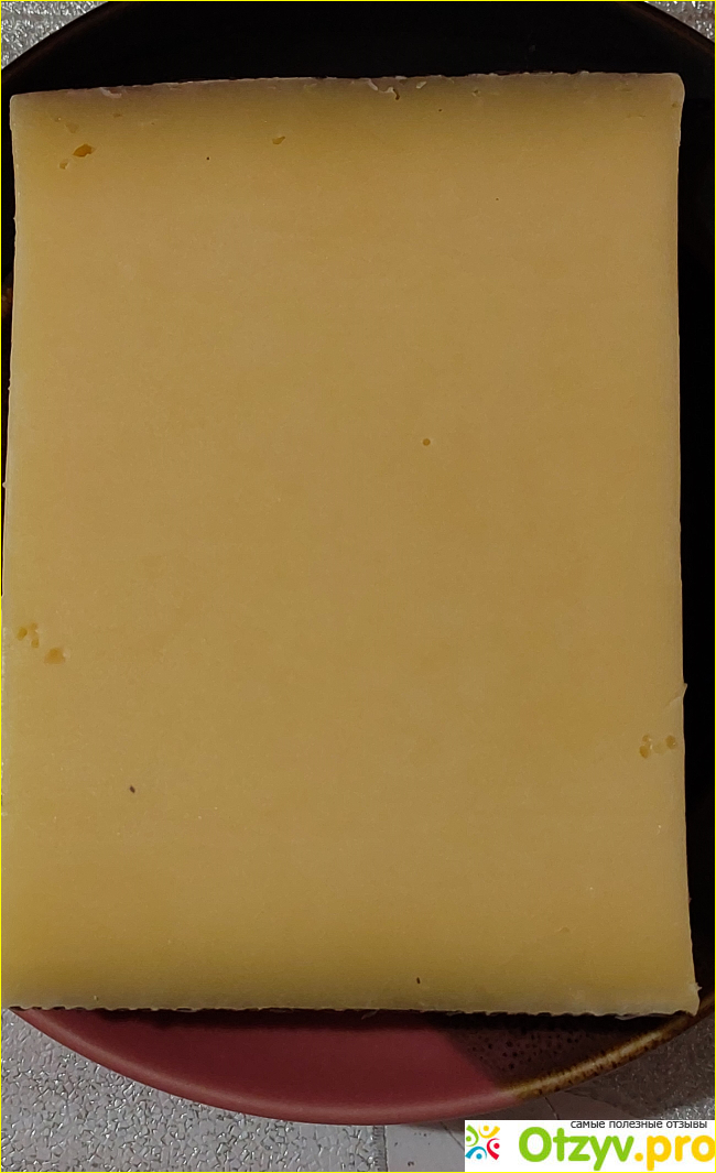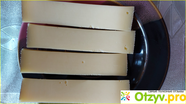 Этот сыр можно есть просто так, без хлеба. В прикуску с кофе или чаем по утрам он отлично подходит. Его удобно нарезать, к ножу он не прилипает. Его цвет ровный, матово-жёлтый, по краям более тёмный.