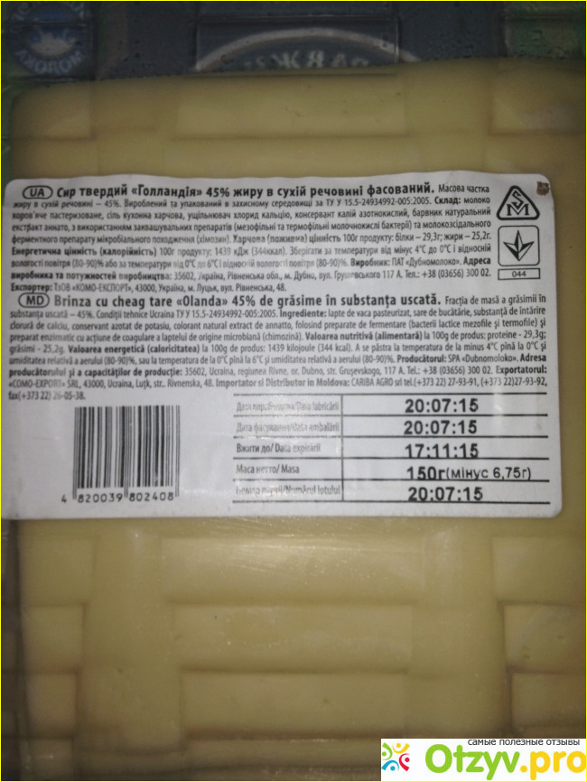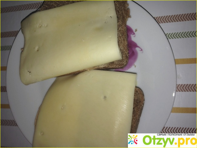 Тут и консервант, и краситель, хоть и натуральный краситель, но все же, не понятно зачем же он нужен. Цвет сыра равномерный, светло-желтый. На кусочках сыра виден рисунок в виде круглых глазок разной величины.