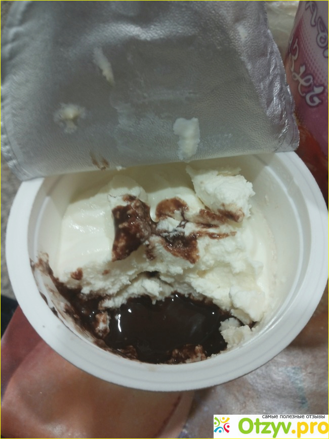 Сам продукт состоит из двух слоев: сверху толстый слой нежного сыра, а снизу наполнитель. Наполнитель жидкий шоколадный с вишневым привкусом. Вместе с сыром получается вкусное сочетание.