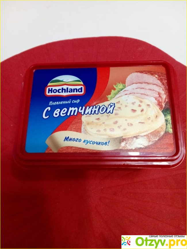 Сыр плавленый с ветчиной Hochland известной немецкой торговой марки Hochland принесла подруга к чаю. Находится он в вот такой порционной ванночке с изображением нарезанной сочной натуральной ветчины.