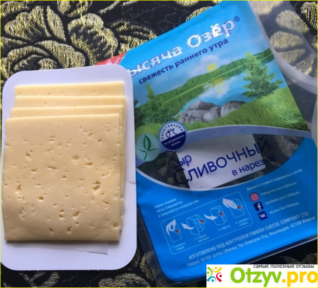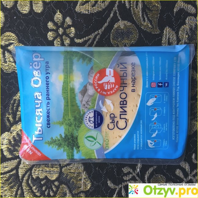 Порадовала новая упаковка. Теперь она выполненна в виде конверта. Ее можно использовать неоднократно, что удобно для хранения. Сыр в ней не засохнет. На лицевой стороне красочная картинка с лесным озером и инструкция как пользоваться упаковкой. На обратной стороне данные о производителе, вес и состав продукта. Не понравилось что в составе есть краситель.