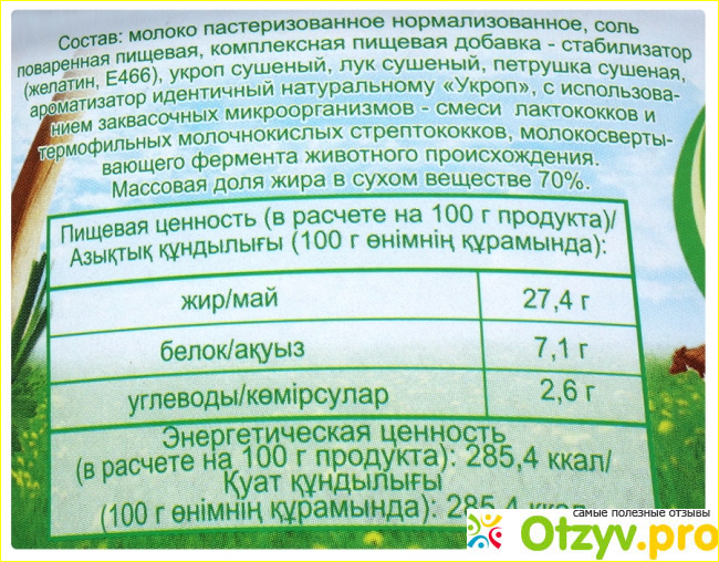 В этом чувствуется как раз и сыр и творог, нечто среднее. Вкус зелени не забивает, только дает оттенок. Добавленные укроп и петрушка добавляют аромат (совместно с искусственным ароматизатором, конечно). Соли в продукте немного, в меру. Даже ощущается, что он, как будто, немного недосолен, но это его не портит.