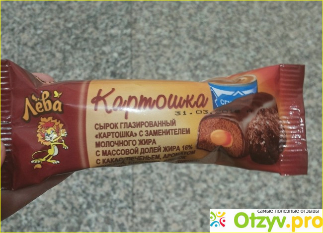 Сам сырок мне нравится, но если сравнивать его с простыми ванильными, то он будет более сладким. Это зависит от состава, а здесь в творог добавлены какао, печенье, плюс ароматы коньяка, бисквита, сливок. И это сырок с начинкой, внутри – вареная сгущенка. Доля жира составляет 16 процентов. Глазурь классическая – шоколадная. Вкусная. Рекомендую “Картошку” к покупке. И, спасибо, всем за просмотр данного отзыва!!
