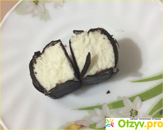 Шоколад в меру приторный, его много, он немного крошится. Не могу назвать его невкусным, так как у него нет этого неприятного «пластилинового« послевкусия. Начинка, а именно сама творожная масса, в состав которой действительно входит творог, судя по написанному производителем составу, упругая, не разваливается, достаточно мягкая, однородная, очень нежная и приятная на вкус. Отчётливо чувствуется вкус кокоса, что обеспечивает кокосовая стружка, которая добавлена в саму массу. Также стоит отметить, что в нем нет никаких других неприятных примесей или комочков.