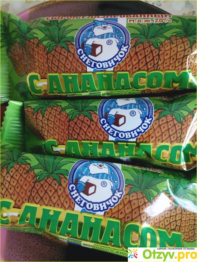 Сегодня я купила сырок с ананасом. Мягкий, нежный творожок с фруктовой начинкой (в данном случае это ананасовый наполнитель), покрытый кондитерской шоколадной глазурью.