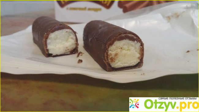 Как видно на фото, глазурь покрывает сырок ровным слоем, нигде нет ни одной проплешины или трещины. А теперь предлагаю посмотреть на начинку.